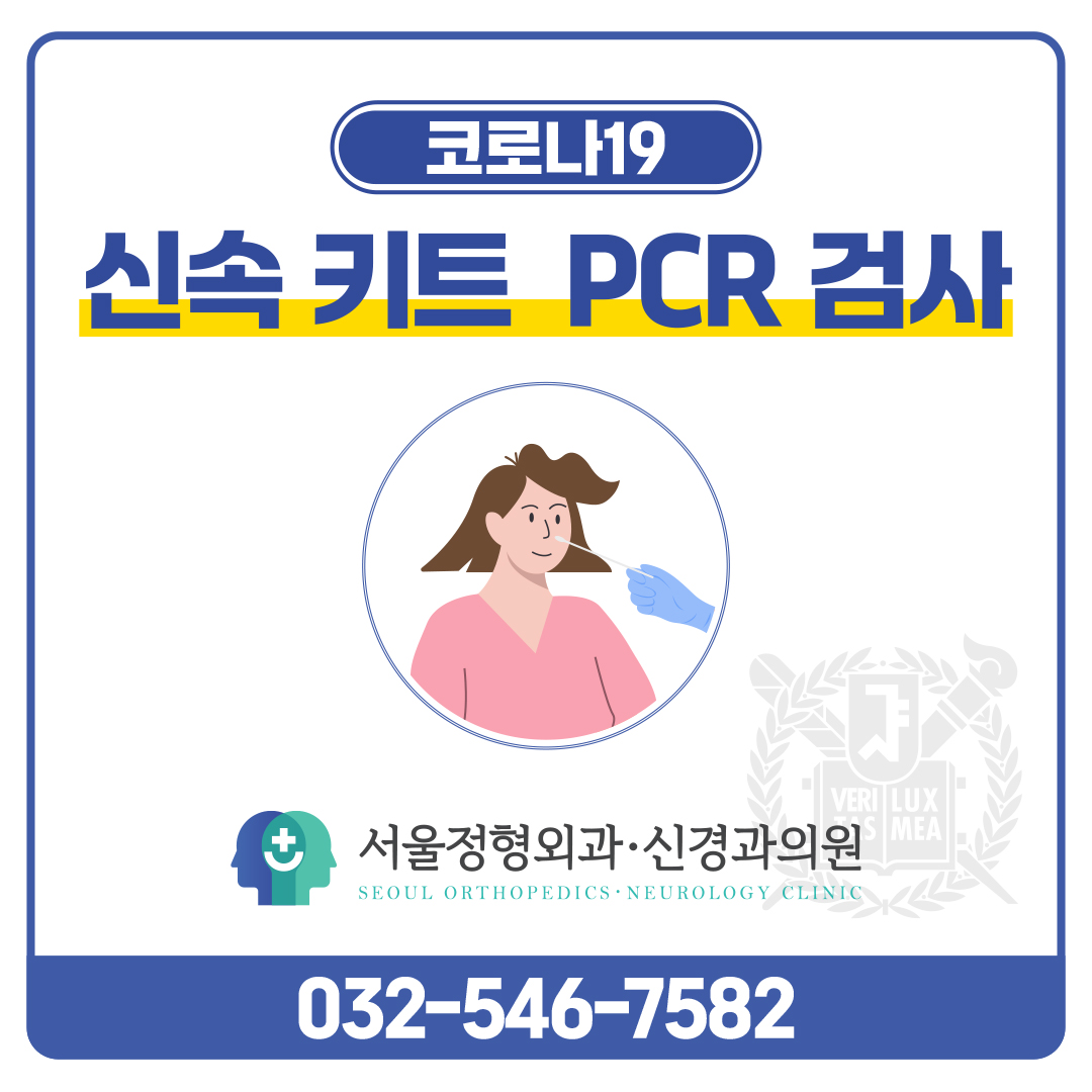 서울정형외과신경과, 코로나 검시 실시 서울정형외과신경과에서는 코로나 신속 항원 검사 및 PCR 검사를 실시하고 있습니다. 증상이 있거나 해외 출국, 직장, 학교 제출용이 필요하신 분들은 빠르고 편리하게 신속항원 및 PCR 검사 등 코로나 검사를 받으실 수 있습니다. 관련 문의는 032 546 7582 를 이용부탁드립니다. |